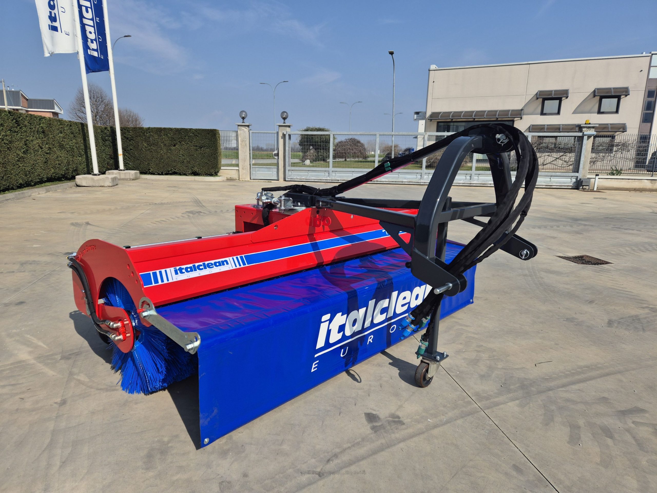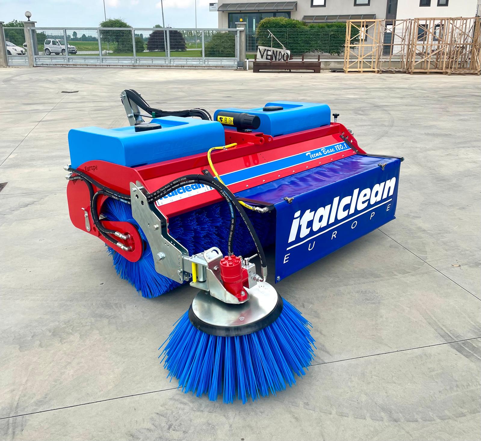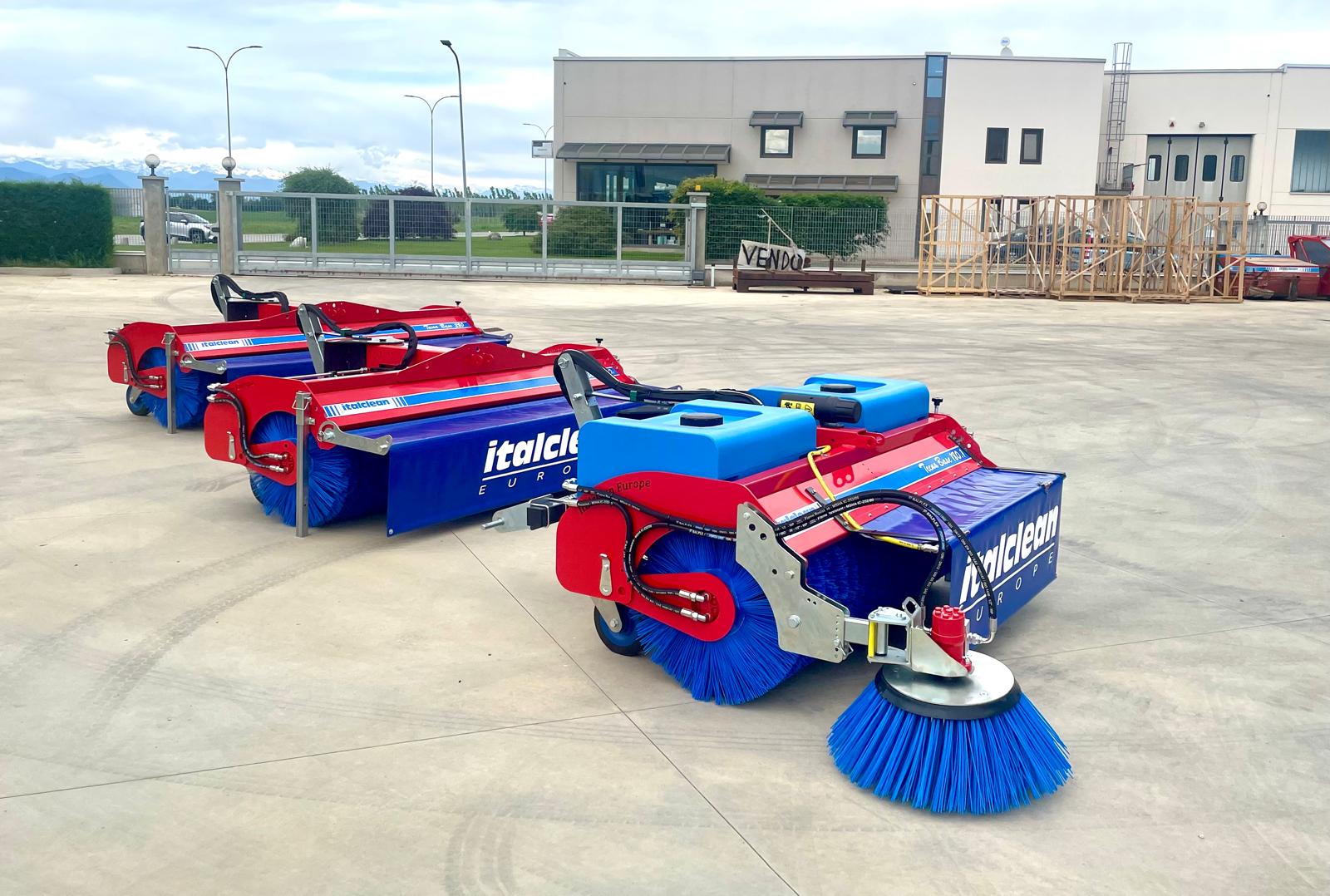 Sweeper: when set up with the side brushes, watering unit and container, unhooking it or keeping it raised in the unloading position returns to its sweeping function for quick clearing operations of bulky debris or snow.