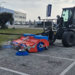 Spazzatrice: quando viene allestita con le spazzole laterali, gruppo umidificante e contenitore, sganciandolo o mantenendolo sollevato nella posizione di scarico ritorna nella sua funzione di spazzolatrice per operazioni di sgombero rapido di detriti voluminosi o neve.